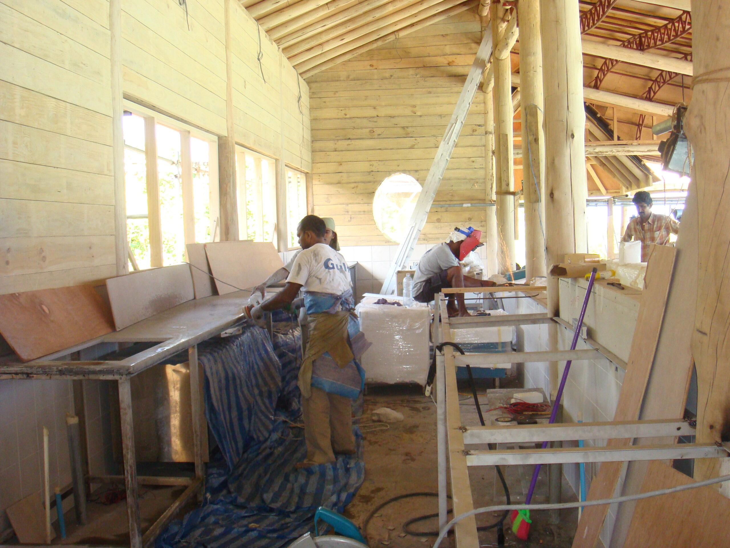 - Interior finishing for villas and service areas, including bathrooms, tiling, fixtures, cabinetry, and decorative detailing